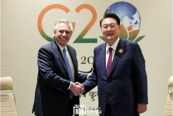 [한국뉴스타임=편집국] G20 정상회의 참석을 위해 인도 뉴델리를 방문 중인 윤석열 대통령은 오늘(현지시간 9. 9, 토) 오후 '알베르토 페르난데스(Alberto Fern?ndez)' 아르헨티나 대통령과 정상회담을 가졌다.