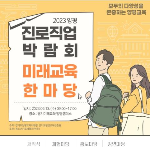 [한국뉴스타임=편집국] 경기도평생교육진흥원 경기미래교육 양평캠퍼스는 경기도양평교육지원청과 13일 ‘2023년 양평 진로직업박람회ㆍ미래교육 한마당’을 공동 주최한다.