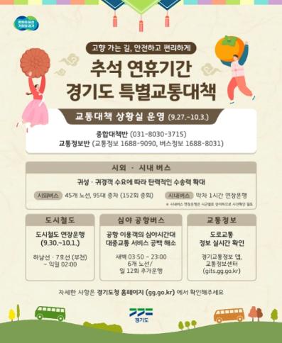 김상수 경기도 교통국장은 “귀성·귀경에 나서는 도민들의 교통 불편이 없도록 이동 지원에 최선을 다하겠다”며 “교통사고 없는 안전한 명절이 되도록 교통법규 준수와 안전운행에 동참해주시기 바란다”고 말했다.