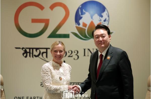 [한국뉴스타임=편집국] G20 정상회의 참석을 위해 인도 뉴델리를 방문 중인 윤석열 대통령은 오늘(9. 10 일, 현지시간) 오후 '조르자 멜로니(Giorgia Meloni)'이탈리아 총리와 정상회담을 가졌다.