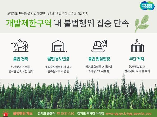 [한국뉴스타임=편집국] 경기도 특별사법경찰단이 9월 18일부터 10월 6일까지 개발제한구역 내 무허가 건축, 불법 형질변경, 불법 용도변경 등 불법행위를 집중 단속한다.