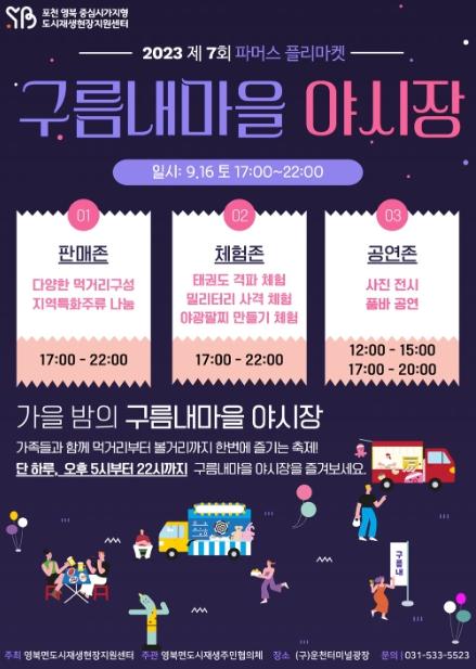 [한국뉴스타임=편집국] 포천시 영북면 도시재생 주민협의체 및 도시재생현장지원센터는 오는 16일 17시부터 22시까지 영북면 운천리 (구)운천터미널광장 일원에서 2023 제7회 파머스 플리마켓 ‘구름내마을 야시장’을 개최한다.