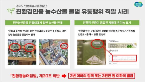 특사경은 유통 중인 친환경 농산물 70종을 수거해 경기도보건환경연구원에 잔류농약 검사를 의뢰한 결과, ‘무농약 꽈리고추’ 1개 품목에서 잔류 농약 성분이 검출돼 관련기관에 행정처분을 요청했다.