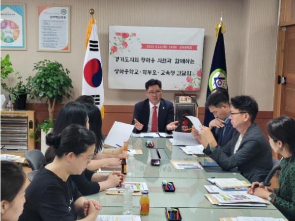 [한국뉴스타임=편집국] 경기도의회 교육행정위원회 정하용 의원(국민의힘, 용인5)은 14일 기흥구 상하동에 위치한 상하중학교에서 학부모 및 교육청 관계자들과 “교육환경 개선을 위한 정담회”를 개최하고, 학부모들의 애로사항 청취 및 학교 환경개선에 필요한 예산 확보 방안 등을 촉구했으며, 정담회 종료 후 환경개선이 시급한 학교 시설물들을 살펴보았다.