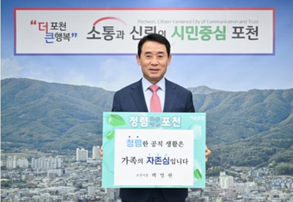 ‘청년다짐 릴레이’의 첫 번째 주자로 나선 백영현 포천시장은 ‘청렴한 공직생활은 가족의 자존심입니다’라고 적힌 다짐 문구를 보이며 “공직자의 청렴한 자세와 의식은 세상에서 제일 중요한 공동체인 가족의 자존심과도 같다. 청렴은 나 자신과 올바른 공직문화, 그리고 시민의 행복을 위해 반드시 실천해야 할 기본 중 기본”이라며 “1천여 포천시 공직자 여러분께선 청렴을 항상 마음속에 새기길 당부한다”고 말했다.