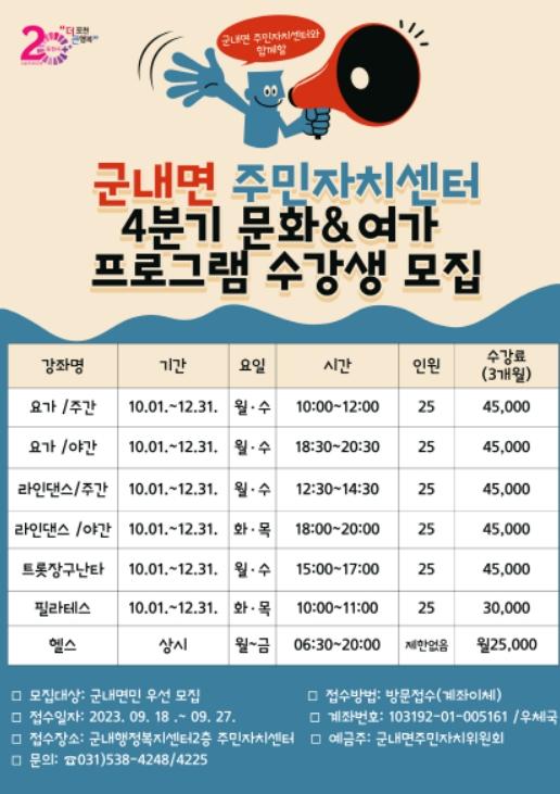 [한국뉴스타임=편집국] 포천시 군내면 주민자치센터는 오는 10월부터 개강하는 ‘군내면 주민자치센터 4분기 문화&여가 프로그램’ 수강생을 모집한다고 밝혔다.