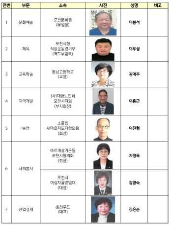 이날 공적심사위원회에서는 공정하고 엄격한 심사를 통해 문화예술부문 이봉석 포천문화원 부원장, 체육부문 이우성 포천시청 직장운동경기부 역도부감독, 교육학술부문 김애주 동남고등학교장, 지역개발부문 이용근 (사)대한노인회 포천시지회 부지회장, 농업부문 이진형 소흘읍새마을지도자협의회장, 사회봉사부문 지정옥 바르게살기운동 포천시협의회장과 김양숙 포천시여성자율방범대장, 산업경제부문 김은순 효천푸드 대표 등 총 7개 부문에 대해 8명의 부문별 수상자를 선정했다.