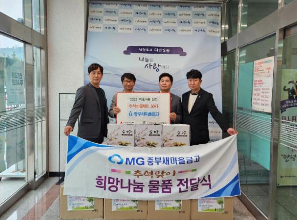 이날 전달식에는 MG중부새마을금고 박백순 이사장, 문태진 상무, 이종현 지금지점장을 비롯해 조영범 다산2동장 등이 참석했다.