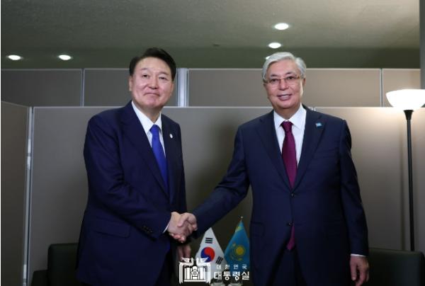 [한국뉴스타임=편집국] 제78차 유엔총회 고위급 회기 참석을 위해 미국 뉴욕을 방문 중인 윤석열 대통령은 9월 19일 오후 '카슴-조마르트 토카예프(Kassym-Jomart Tokayev)' 카자흐스탄 대통령과 취임 이후 처음으로 정상회담을 가졌다.