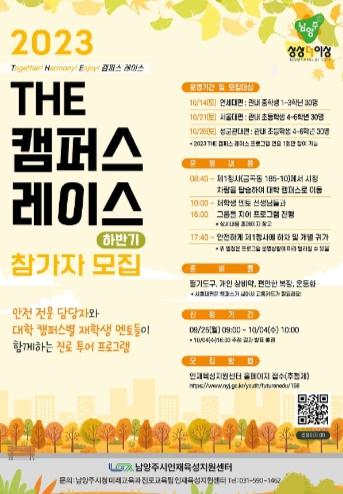 [한국뉴스타임=편집국] 남양주시는 오는 10월 14일, 21일, 28일 3일간 지역 내 초·중학생의 진로 탐색 역량 강화를 위한 진로 교육 프로그램 ‘THE 대학캠퍼스 레이스’하반기 행사를 운영한다고 밝혔다.