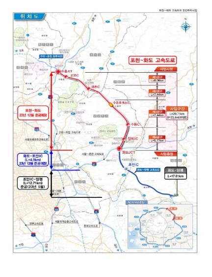 한편, 지난 5월에 개통한 수도권 제2순환선(화도~양평) 중 미준공 된 화도~조안IC (4.9km) 구간이 포천-화도 민자고속도로와 연말 동시 개통을 목표로 추진되고 있으며, 서울~양양 고속도로 및 중부내륙선과 연결돼 지역 경제 활성화와 주민 삶의 질 향상에 크게 기여할 전망이다.