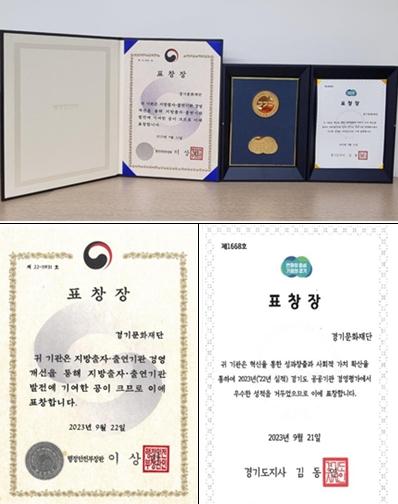 또한 경기문화재단은 2023년(2022년 실적) 경기도 공공기관 경영평가 우수기관(나등급/A등급)으로 뽑혀 경기도지사 표창을 수상했다. 경기문화재단은 2020년(2019년 실적)부터 4년 연속 A등급을 달성하는 성과를 보여 명실상부한 도내 우수 공공기관임을 증명했다.