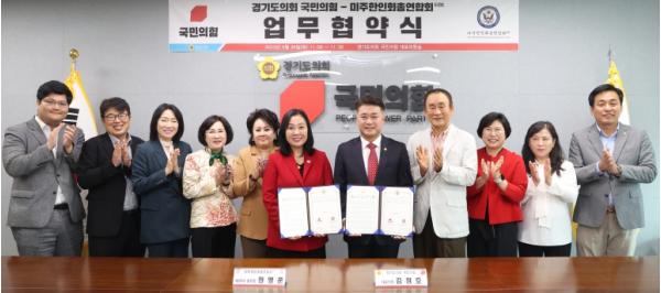 이날 협약식에는 도의회 국민의힘 김정호 대표의원, 양우식 수석부대표, 김영기 정무수석, 오준환 정책위원장, 이은주 기획수석, 이애형 수석대변인, 이혜원 소통협력수석, 오창준 청년부대표, 조희선 의원(비례)과 미주한인회총엽합회 정명훈 총회장, 이희경 부회장, 강지원 특보, 김백현 홍보수석 및 정준용 경기도당 국민의힘 여성위원회 부위원장이 참석했다.