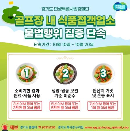 [한국뉴스타임=편집국] 경기도 특별사법경찰단은 10월 10일부터 20일까지 화성시 등 12개 시군 골프장 내 클럽하우스 등 식품접객업소 150곳을 대상으로 불법행위를 집중 단속한다.