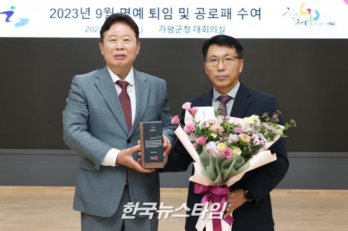 [한국뉴스타임=보도국] 홍성천 가평군 북면맞춤형복지팀장이 9월 30일자로 명예퇴임하며 27일 가평군청 대회의실에서 명예퇴임식 및 공로패 수여식을 가졌다.