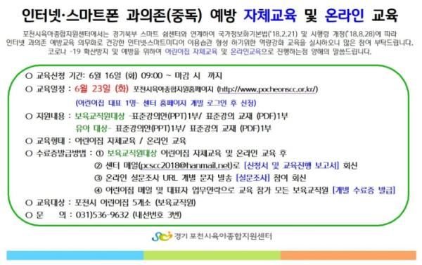[KNT한국뉴스타임] 포천시육아종합지원센터는 경기북부 스마트쉼센터와 업무협약을 맺고 6월 23일부터 포천지역 어린이집 보육교직원 및 영유아를 대상으로 인터넷?스마트폰 과의존 예방교육을 온라인 및 자체교육으로 진행하고 있다.
