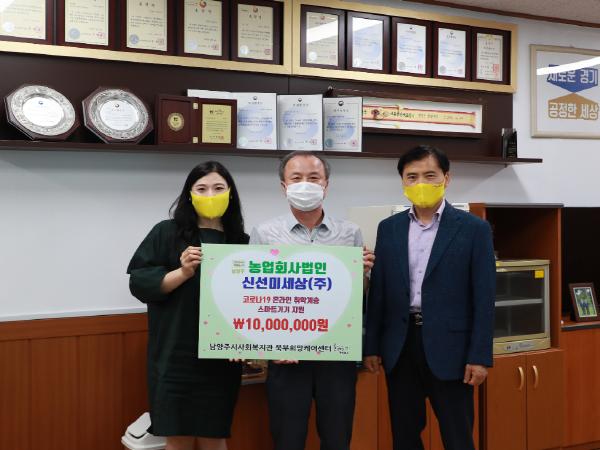 [KNT한국뉴스타임=남양주] 남양주시 진접읍에 소재한 ㈜신선미세상(대표 손우기)은 자회사 푸르본과 샤인트리와 함께 14일 코로나19 극복 성금 1000만원을 북부희망케어센터에 전달했다.