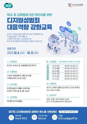 [한국뉴스타임=편집국] 경기도여성가족재단 경기도디지털성범죄피해자원스톱지원센터가 10월 4일부터 11일까지 도내 학교 및 교육행정기관 관리자를 대상으로 디지털성범죄 대응 역량 강화 교육 참여자를 모집한다.