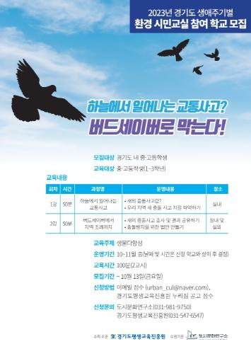 [한국뉴스타임=편집국] 경기도평생교육진흥원은 지속가능한 미래를 위한 기후시민의식 함양과 생애주기에 맞는 생태환경 감수성을 높이기 위해 찾아가는 생애주기별 환경 시민교실을 운영한다며, 10월 13일까지 참여 학교 및 기관을 모집한다.