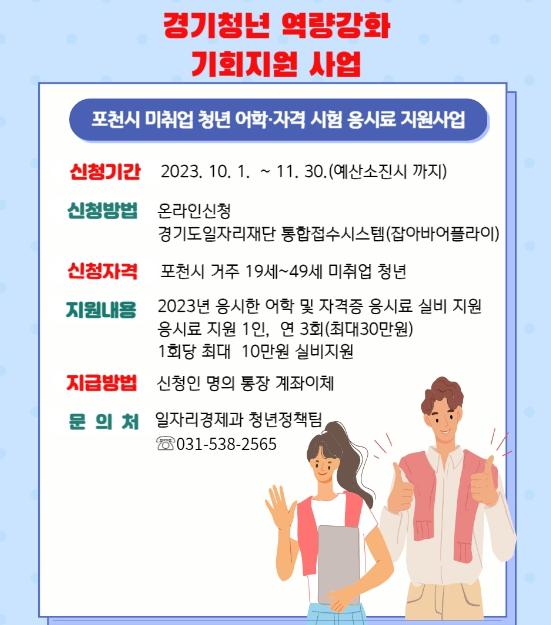 [한국뉴스타임=편집국] 포천시는 오는 11월 30일까지 2023년 ‘경기청년 역량 강화 기회 지원 사업’의 하반기 ‘미취업 청년 어학·자격시험 응시료 지원사업’을 접수한다고 밝혔다.
