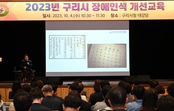 [한국뉴스타임=편집국] 구리시는 10월 4일 시청 대강당에서 전 직원을 대상으로 김재학 장애인식 개선 전문 강사를 초빙해 ‘모두가 함께하는 세상 만들기’라는 주제로 2023년 장애인식 개선교육을 실시했다.