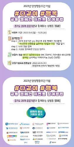재단은 28개 경기도 공공기관과 연계해 도내 성평등 문화 확산에 동참하자는 의미로 ‘다같이, 행복’ 캠페인 영상을 제작하고 이와 관련한 영상을 누리소통망(인스타그램, 페이스북, 블로그)을 통해 해시태그(#다같이 #행복)를 달아 공유하는 이벤트를 9월 4일부터 20일까지 진행했다. 그 결과 850여 명의 도민이 성평등 문화확산에 동참, 응원의 메시지를 보냈다.