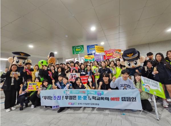 이날 구리남양주교육지원청, 남양주남부경찰서 학교전담경찰관(SPO), 다산새봄중학교 학생, 학부모, 교사 등 100여 명은 하교길 학교폭력예방 활동에 참여한 학생에게 하이파이브 하며 친구와 우정을 나누자는 메시지를 전달했다.