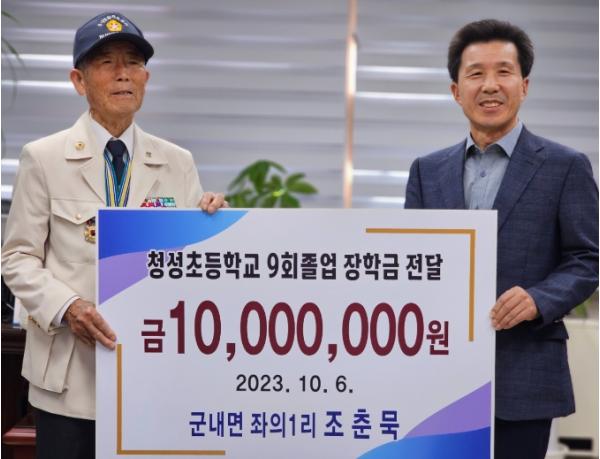 [한국뉴스타임=편집국] 군내면 행정복지센터는 지난 6일 6.25 참전유공자인 조춘묵 어르신(92세)께서 자신의 모교인 청성초등학교(군내면 직두리 소재) 학생들을 위해 현금 일천만 원의 장학금을 기부했다고 밝혔다.