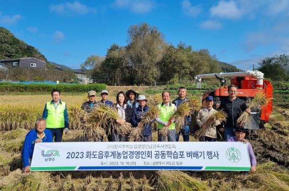 [한국뉴스타임=편집국] 남양주시 화도읍후계농업경영인회는 10일 회원들이 공동으로 재배하는 학습포(화도읍 금남리, 답내리 일원)에서 벼베기 행사를 진행했다.