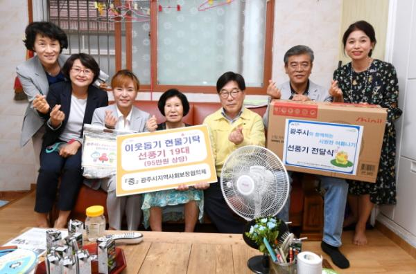 이번 선풍기 전달은 코로나19로 인해 무더위 쉼터를 이용하기 어려운 상황에서 집안에서 더운 여름을 보내야 하는 어르신들을 위해 마련된 것으로 광주시지역사회보장협의체 변윤정 민간위원장이 선풍기 19대(95만원 상당)를 기탁해 진행됐다.