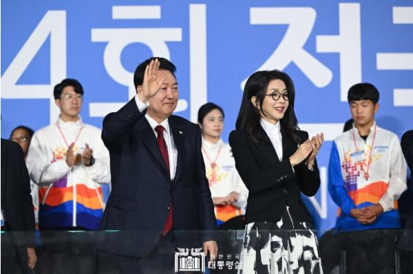 [한국뉴스타임=편집국] 윤석열 대통령 부부는 10월 13일 저녁 목포종합경기장에서 열린 제104회 전국체육대회(이하 전국체전) 개회식에 참석했다.