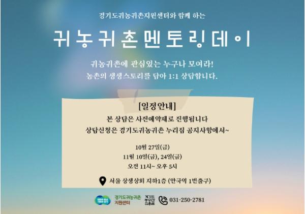 [한국뉴스타임=편집국] 경기도와 경기도농수산진흥원이 운영하는 경기도귀농귀촌지원센터에서는 10월 27일 ‘행복멘토링 데이’를 시작으로 총 3회에 걸쳐 서울시 종로구 상생상회에서 ‘2023년도 2차 찾아가는 귀농귀촌 상담실’을 운영한다.
