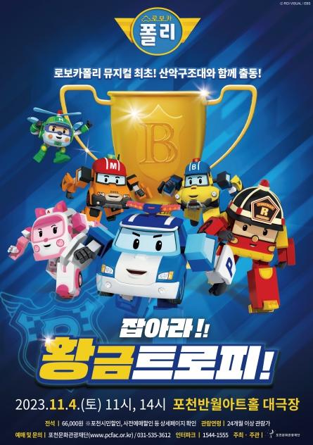 [한국뉴스타임=편집국] 재단법인 포천문화관광재단은 오는 11월 4일 오전 11시와 오후 2시, 포천반월아트홀 대극장에서 어린이와 가족들을 위한 뮤지컬 '로보카 폴리 ? 잡아라! 황금트로피!'를 선보인다고 밝혔다.