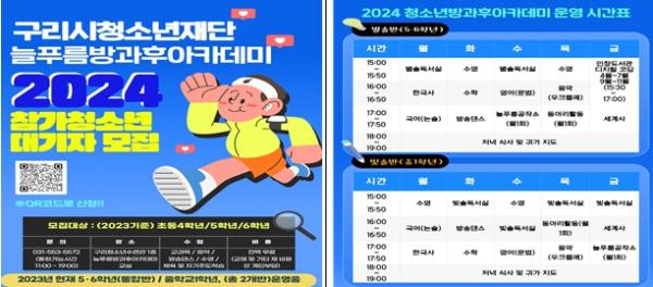 참가를 희망하는 청소년은 늘푸름방과후아카데미 포스터에 있는 QR코드로 접속해 신청하거나 구리시청소년재단(031-553-5572)으로 전화 신청하면 된다. 아울러, 신청 결과는 개별 통보될 예정이다.