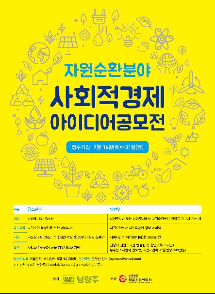 시 관계자는 “이번 공모전이 단순히 아이디어를 모집하고 시상하는 것에서 그치는 것이 아니라 참가자들의 아이디어를 통해 지역이 바뀔 수 있는 기회가 될 것”이라며,“자원순환분야의 사회적경제기업을 발굴하고 성장하는 계기가 되기를 바란다.”고 전했다.