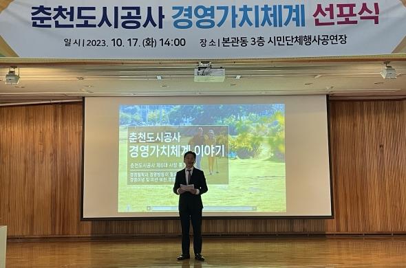 [한국뉴스타임=편집국] 춘천도시공사 新 경영가치체계 선포식이 17일 춘천도시공사 3층 시민단체행사공연장에서 개최됐다.