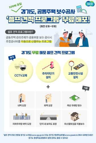 [한국뉴스타임=편집국] 경기도가 전국에서 유일하게 공동주택 입주자대표회의와 관리주체가 유지?보수공사를 추진할 때 추정공사비를 직접 계산할 수 있는 ‘셀프 견적 프로그램’에 3개 공종(工種. 공사의 종류)을 추가한 9개 공종을 제공한다고 18일 밝혔다.