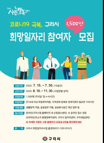 구리시(시장 안승남)는 15일부터 코로나19에 따른 경제위축으로 고용충격이 현실화됨에 따라 경제적인 어려움에 처한 일자리 취약계층의 생계안정 및 지역경제 회복을 위한‘희망일자리사업’참여자를 모집한다.