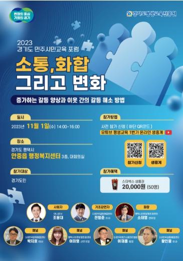 [한국뉴스타임=편집국] 경기도평생교육진흥원은 11월 1일 평택시 안중읍행정복지센터 3층 대회의실에서 ‘2023년 경기도 민주시민교육 인식개선 포럼’을 개최한다.