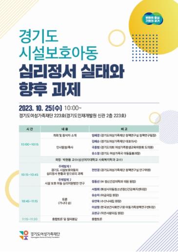 경기도의 제안 과제인 ‘경기도 시설보호아동 심리정서 실태 및 지원방안 연구’의 일환으로 진행되는 이날 포럼은 경기도 내 시설보호아동을 대상 으로 실시한 실태조사의 연구 결과를 공유하는 자리다.