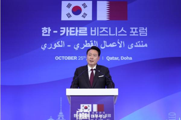 [한국뉴스타임=편집국] 카타르를 국빈 방문 중인 윤석열 대통령은 오늘(현지시간 10. 25, 수) 오후 한-카타르 비즈니스 포럼에 참석해 그간의 양국 경제협력 성과를 평가하고 경제인들의 노고를 치하했다. 또한, 세계 경제의 대전환기를 맞아 새로운 50년의 공동 번영을 위한 새로운 파트너십을 함께 준비해 나갈 것을 당부했다.