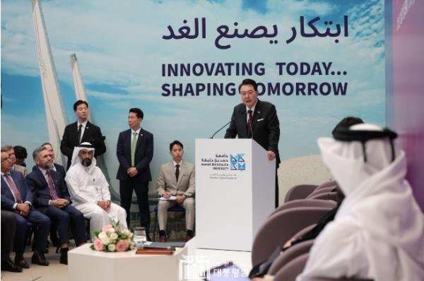 [한국뉴스타임=편집국] 윤석열 대통령은 오늘(현지시간 10. 25, 수) 오후 카타르 에듀케이션 시티에 위치한 연구 중심 대학인 하마드 빈 칼리파 대학교(HBKU)에서 개최된 '청년 리더와의 대화' 행사에 참석했다. 대통령은 해외 순방 때마다 그 나라의 학술연구와 혁신을 선도하는 대학을 방문해 청년들과 소통하고 있다.