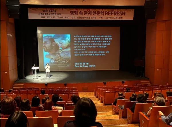 [한국뉴스타임=편집국] 광주하남교육지원청은 2023년 지역특화 인문학 아카데미 사업의 일환으로, 지난 25일 영화치료 전문가 방미나 교수를 초청해 "회복"이라는 주제로 남한산성아트홀 소극장에서 특강을 진행했다. 방미나 교수는 나우인사이드심리상담센터 대표이자 2009년부터 영화힐링모임인 상생시네마클럽 대표로 활동하며 200회 넘게 영화를 매개로 시민들을 만나고 있는 영상영화치료 전문가이다.