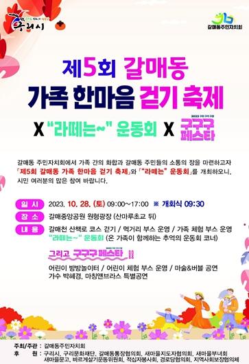 [한국뉴스타임=편집국] 구리시 갈매동 행정복지센터는 갈매동 주민자치회(회장 박승원) 주관으로 오는 10월 28일 오전 9시부터 오후 5시까지 '제5회 갈매동 가족 한마음 걷기 축제'를 개최한다고 밝혔다.
