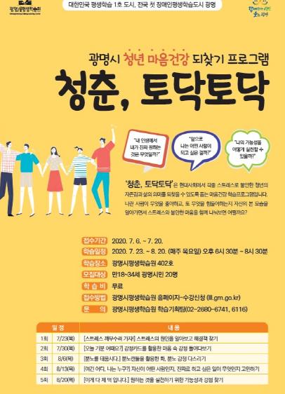 [KNT한국뉴스타임] 광명시는 각종 스트레스로 힘든 청년의 마음을 위로하고자 마음건강 되찾기 프로그램 ‘청춘 토닥토닥’ 을 운영한다.