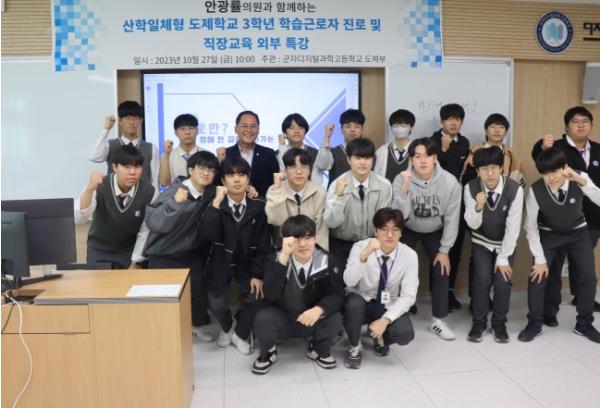 경기도의회 교육행정위원회 안광률 부위원장(더불어민주당, 시흥1)은 27일 군자디지털과학고등학교에서 1일 진로특강 강사로 나서, 사회 진출을 앞둔 고등학교 3학년 학생들에게 향후 진로를 주제로 특강을 진행했다.