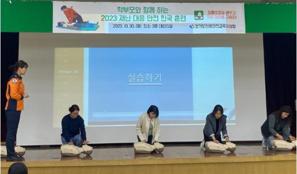 “2023년 재난대응 안전한국훈련‘은 10월30일 월요일부터 11월 3일까지 학교시설 재난 및 사고에 대한 종합훈련을 추진하고자 실시하며 이날 훈련은 ‘학부모와 함께하는 재난대응 안전한국훈련 CPR심폐소생술’로 관내학교 학부모 20여명과 안양소방서 심폐소생술 교육 소방관들이 참여했다.