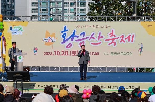 ‘가족과 함께 황금산’이라는 주제로 작년에 이어 올해 2회를 맞이한 황금산 축제에는 주광덕 남양주시장을 비롯한 주요 내빈 및 지역 주민 등 약 2,000여 명이 참석해 큰 호응을 얻었다.