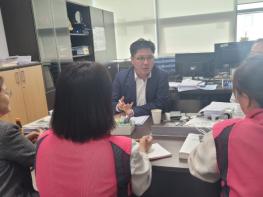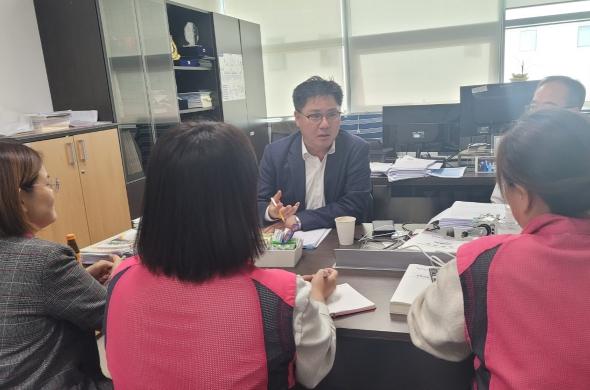 이날 간담회에는 조선희 사무처장, 조아라 법규부장 등이 참석하여 비정규직 근로자들이 직면한 여러 가지 어려운 근무 환경에 대해서 말했으며, “먼저 2023.3월 공무직원들의 근무 환경개선에 관심을 갖고 조례안을 대표 발의해 주신 것에 대해서 감사를 드린다.” 라고 말하고, 아울러 △ 교육공무직원의 복무 환경개선을 위한 조례안이 통과 됐으나 아무런 변화가 없다. △ 여러 가지 문제 중에서도 공무직원들의 질병 관련 휴직 등의 문제가 심각하다. △ 환경미화, 돌봄관련, 급식종사 관련 공무직원들이 많은 어려움을 겪고 있다. △ 발의된 조례가 실현, 정착되는 것이 중요하다. 등의 어려운 근무 환경 내용에 대해서 여러 가지 의견을 제시하고 의견을 공유했다.