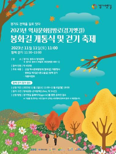 ‘경기옛길 봉화길 개통식 및 걷기 축제’의 참가 접수는 11월 1일부터 6일까지 진행되며, 경기옛길 누리집(ggcr.kr)을 통해 접수할 수 있다.